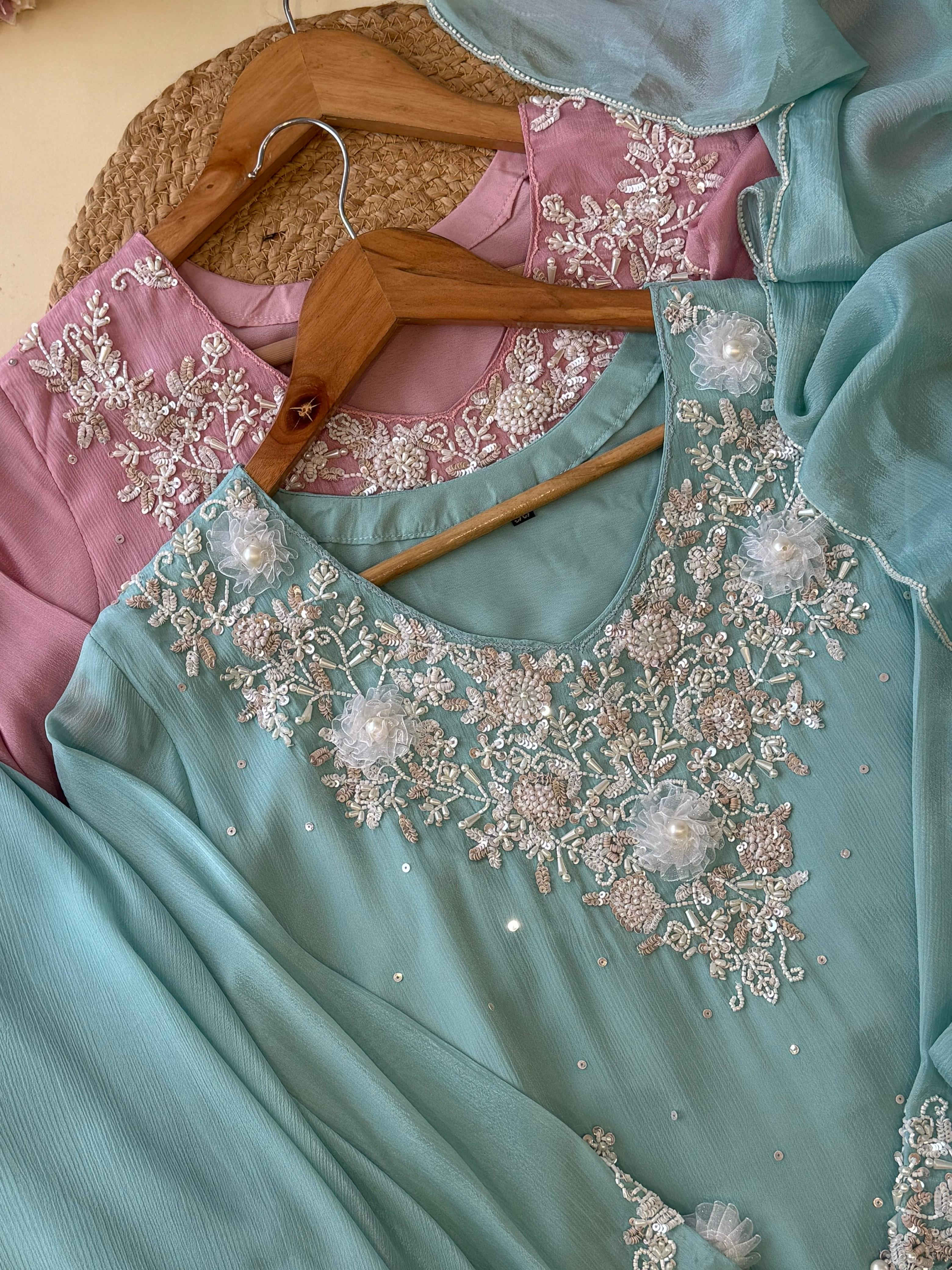 The dress is kurta with intricate embroidery, featuring a V-neckline and long sleeves. The kurta is adorned with floral patterns and pearls along the neckline, hem, and scattered throughout the fabric, giving it a delicate and elegant appearance. The matching dupatta adds to the overall traditional Indian look of the outfit.
