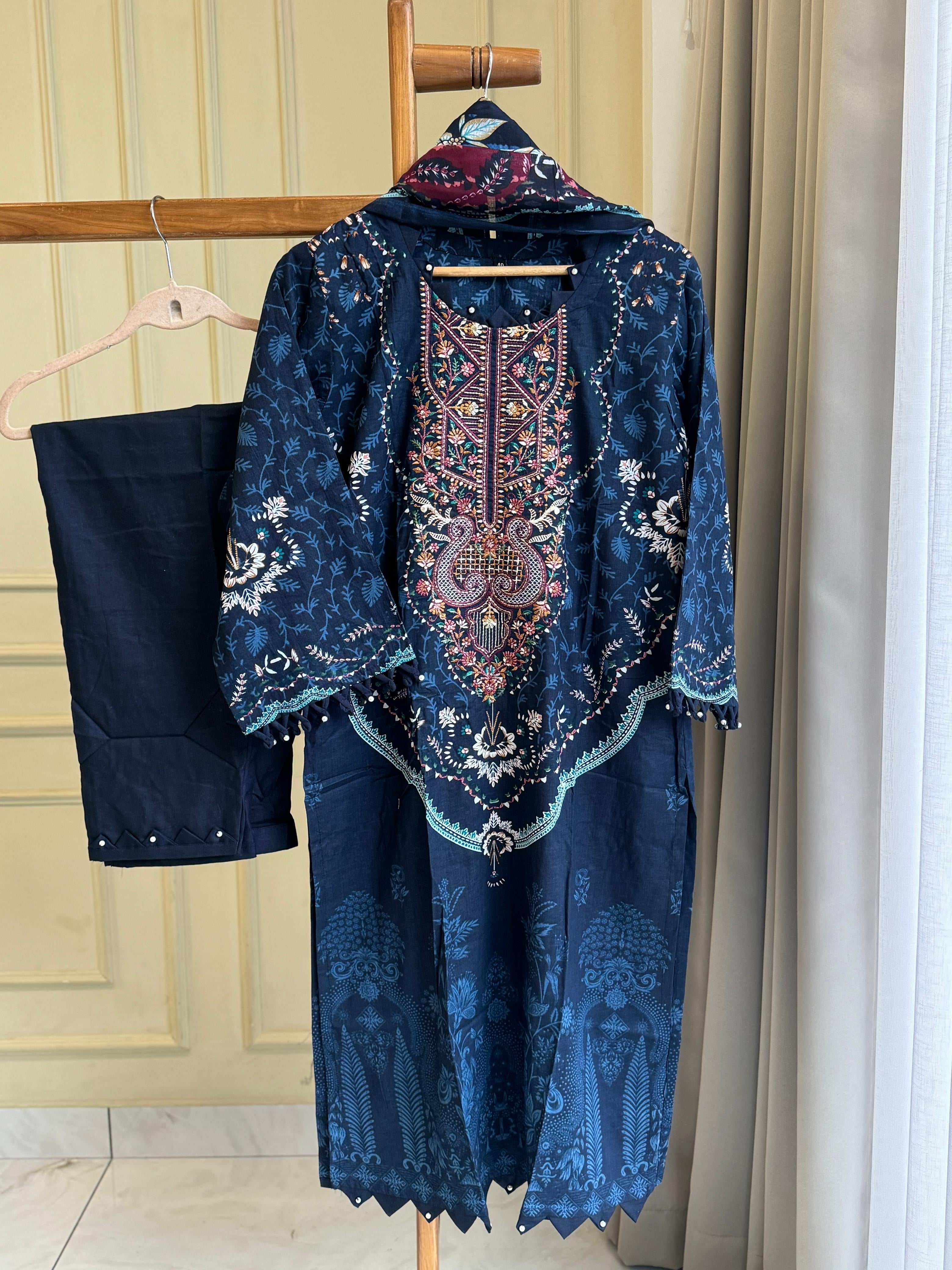 Self embroidered cotton printed casual suit with tassels and cotton bottom with pockets   Type: Stitched/ ready  Fabric: Cotton shirt Bottom: Cotton  Dupatta: digital printed cotton Dupatta  Fit: Casual wear Wash Care: Gentle wash Work: Self Embroidery and prints Sizes : Large, xl, xxl, xxxl