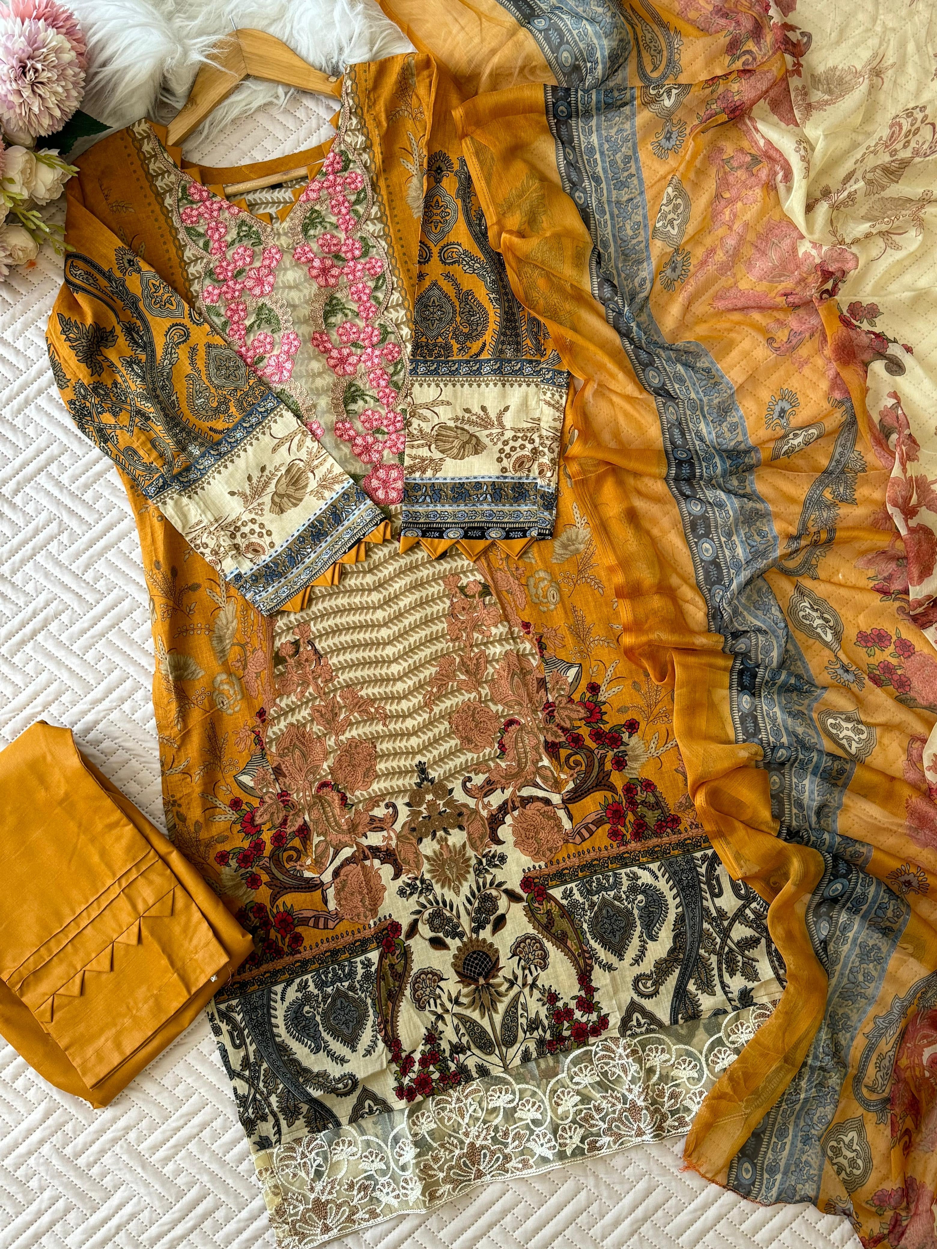 A stunning yellow salwar kameez with intricate floral and paisley prints in shades of pink, blue, and brown. The outfit includes a kameez (top) with detailed embroidery on the neckline and lacework at the bottom, matching yellow salwar (pants), and a beautifully printed dupatta (scarf).
