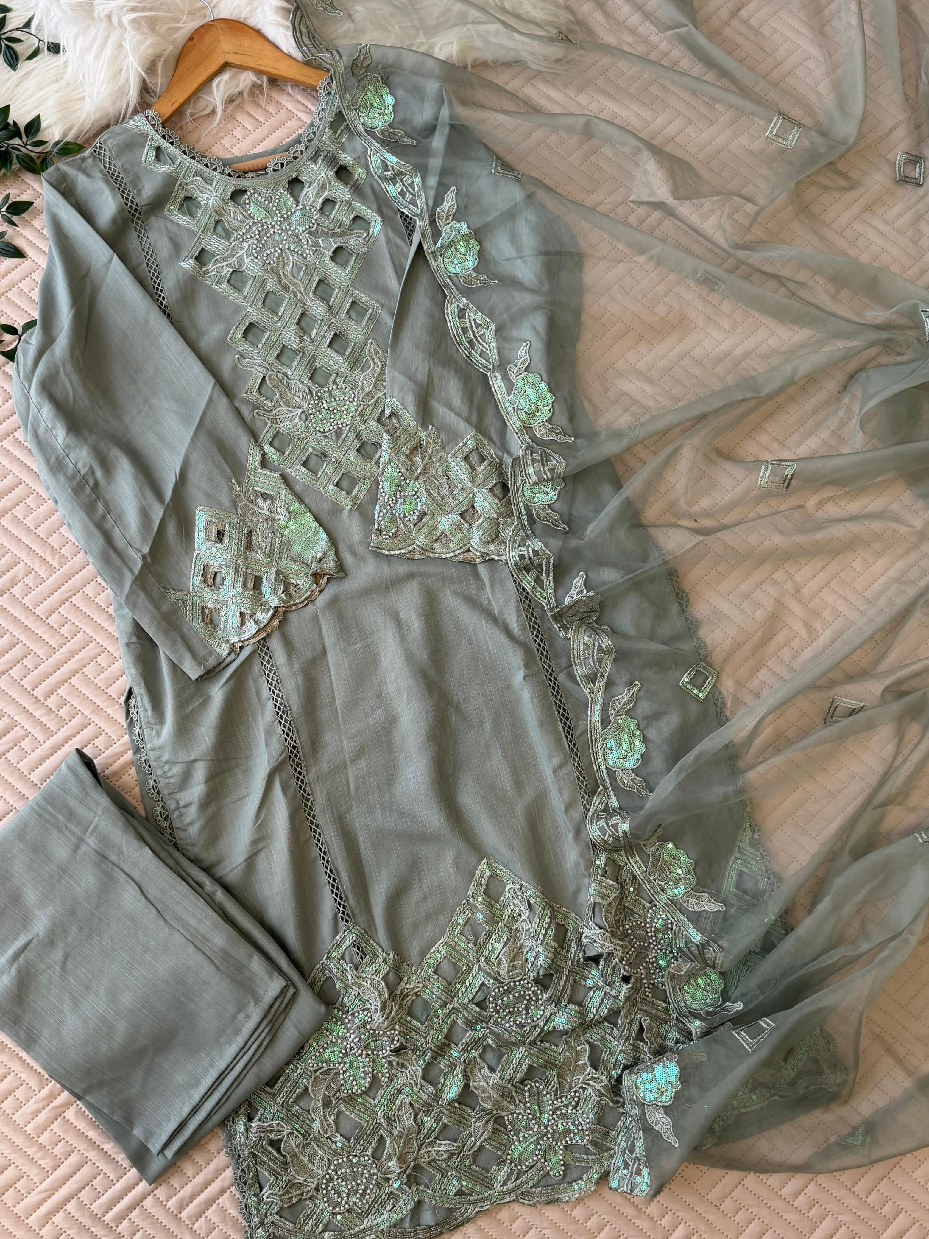 Gorgeous Heavy Embroidery, Cut Work & Plating on Tunic & Sleeves. Paired with Embroidered Pant and Organza Dupatta for a Glamorous Look! Details: 🔲 Top: Velour Slub with Inner 🔲 Bottom: Velour Slub 🔲 Dupatta: Organza Available Sizes: xl and xxl