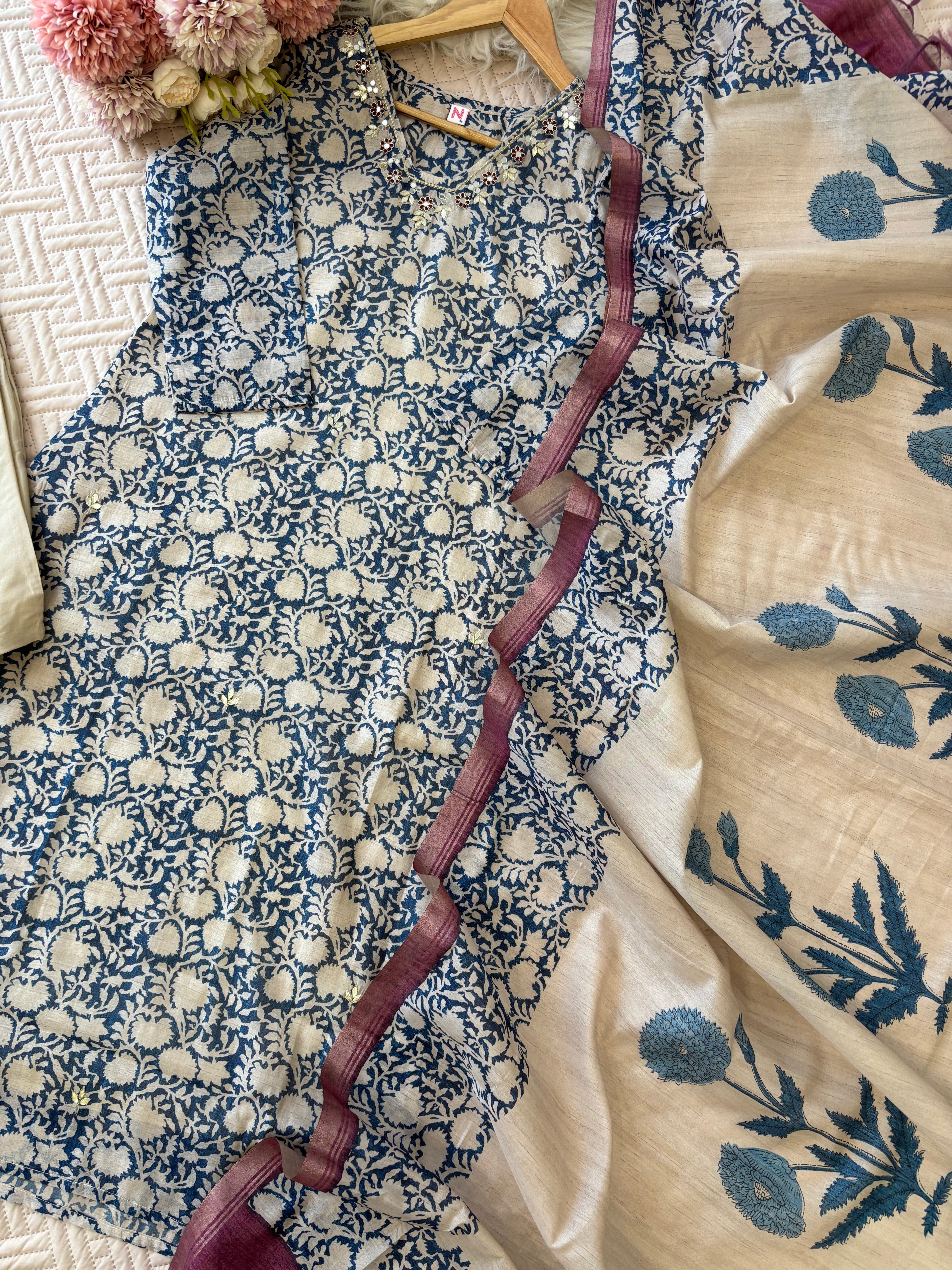 The image shows a beautiful blue and white floral printed kurti with a matching dupatta. The kurti has a blue base with white floral patterns and is paired with a beige dupatta that has blue floral motifs and maroon borders. There's also a glimpse of cream-colored pants or a bottom in the corner. The outfit looks like a lovely ethnic ensemble, perfect for a casual or semi-formal occasion. Type: stitched/ready Fabric: Chandheri- Silk Bottom: silk Dupatta: Organza Fit: Casual/office wear  Wash care: Gentle wash  Size: medium, large, xl, xxl