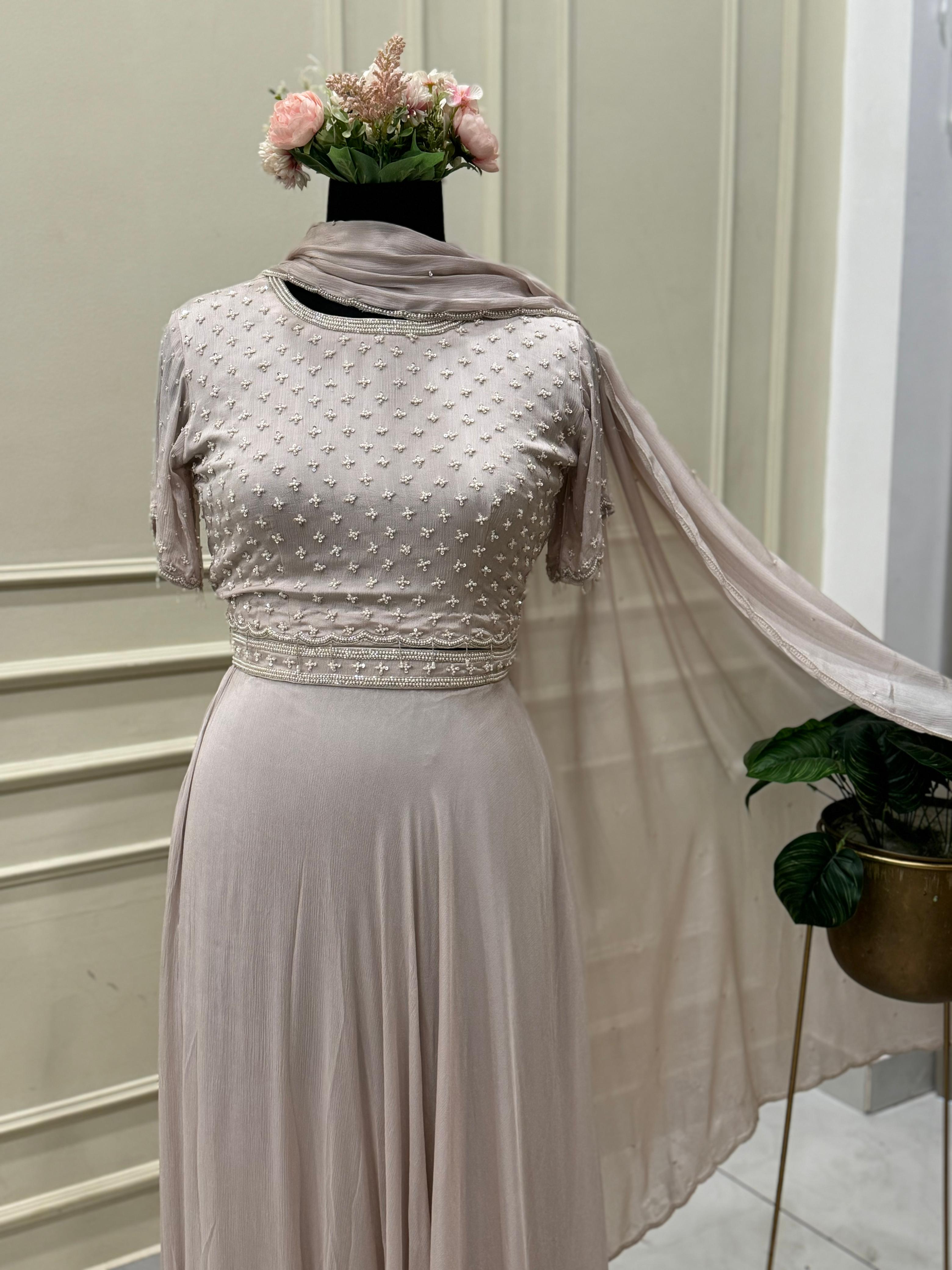 Chinnon Handworked crop Top and flaired skirt and scalloped dupatta
