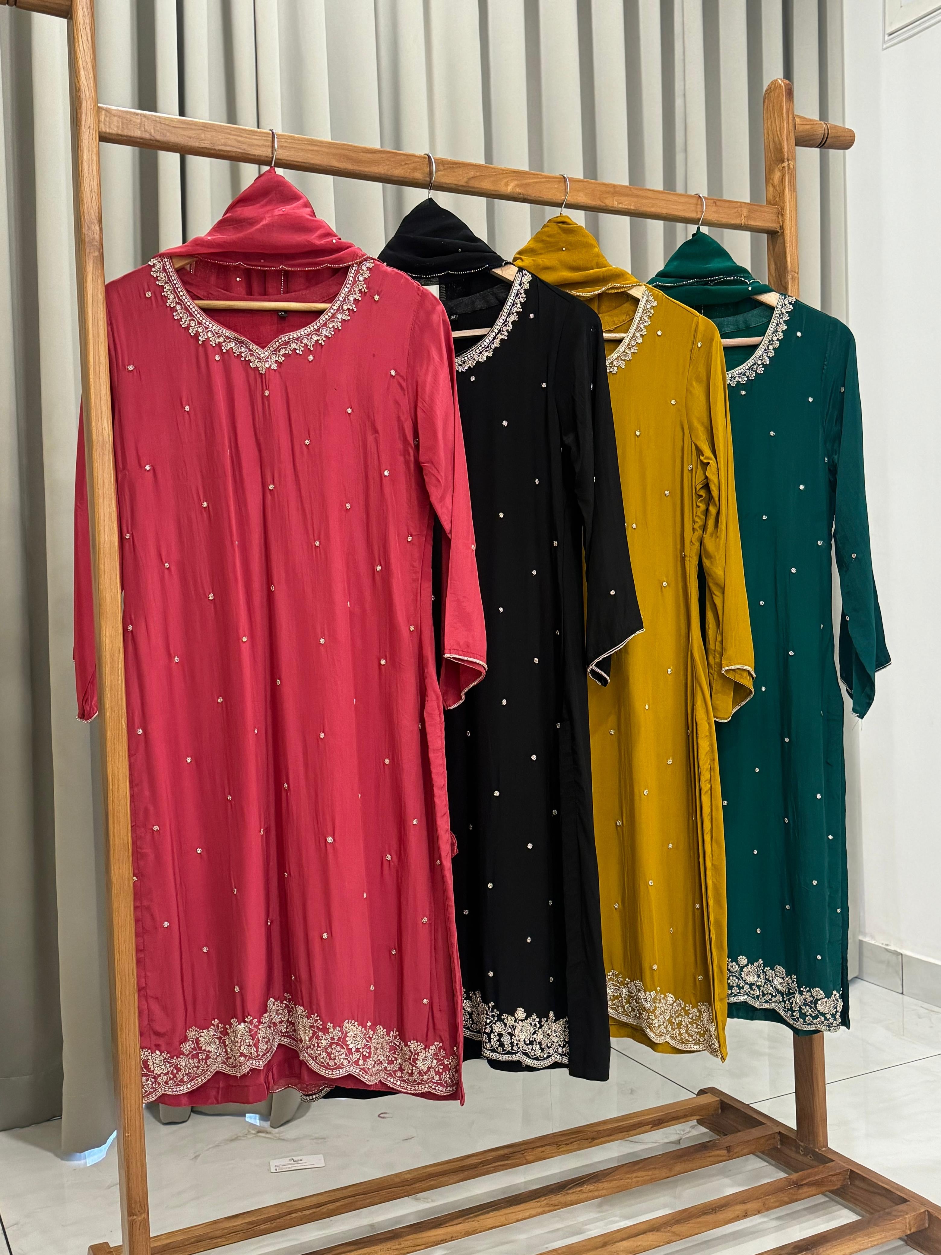 Type :stitched Fabric: chinnon  Pure organza scalloped DupattaChinnon ShirtMuslin bottom Length: 41" Sleeve length: 19"   Sizes- medium, Large, XL, XXL,