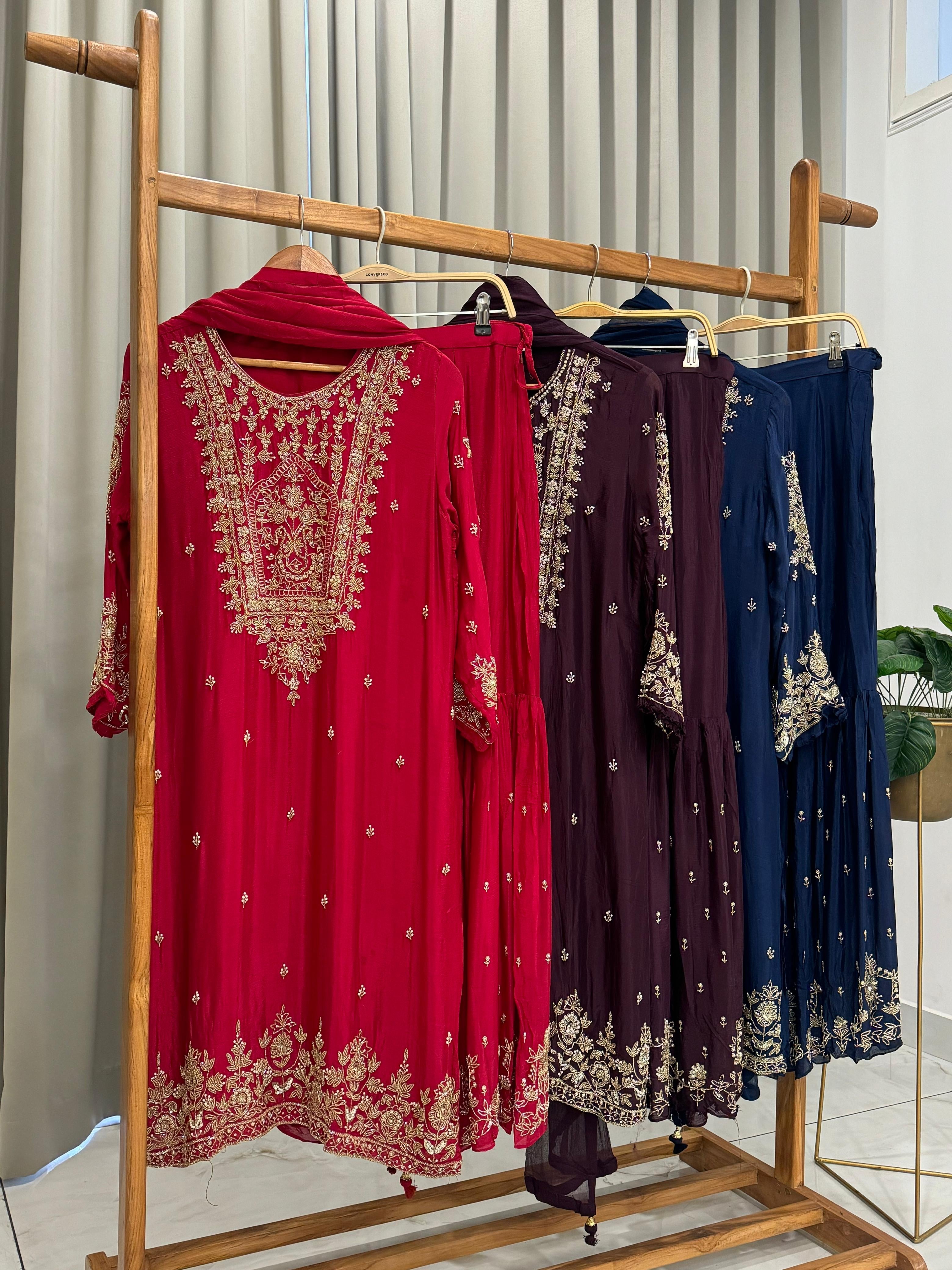 A heavily handworked Sharara suit is a luxurious and intricately designed ethnic ensemble, often worn for weddings, festive occasions, and grand celebrations.