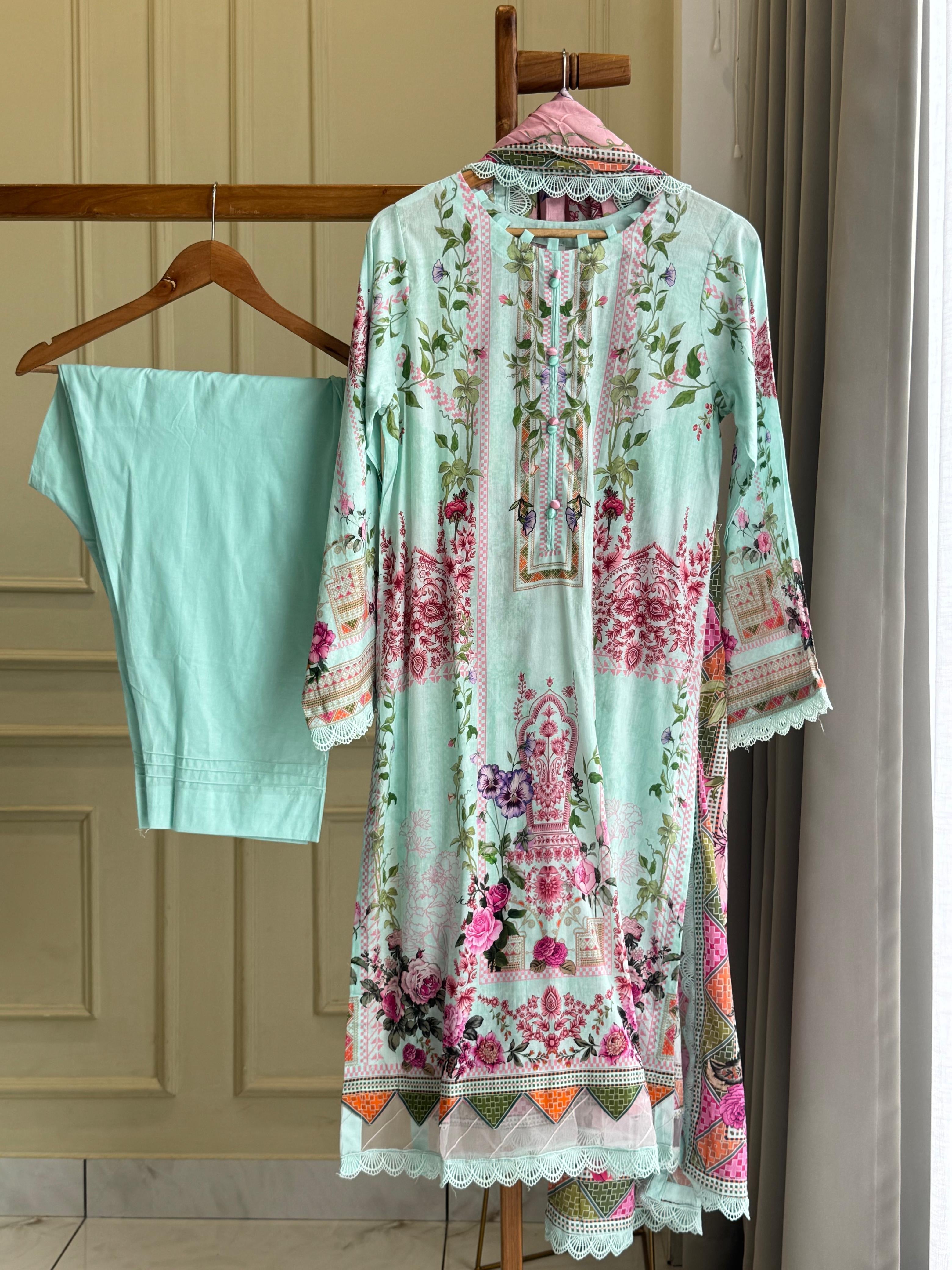 Type: Stitched/ ready Fabric: Lawn Bottom: Lawn Dupatta: cotton with lace Detailings Fit: Casual Wear Wash Care: Gentle wash only Size: medium, Large ,xl Top Length: 43/44 approx