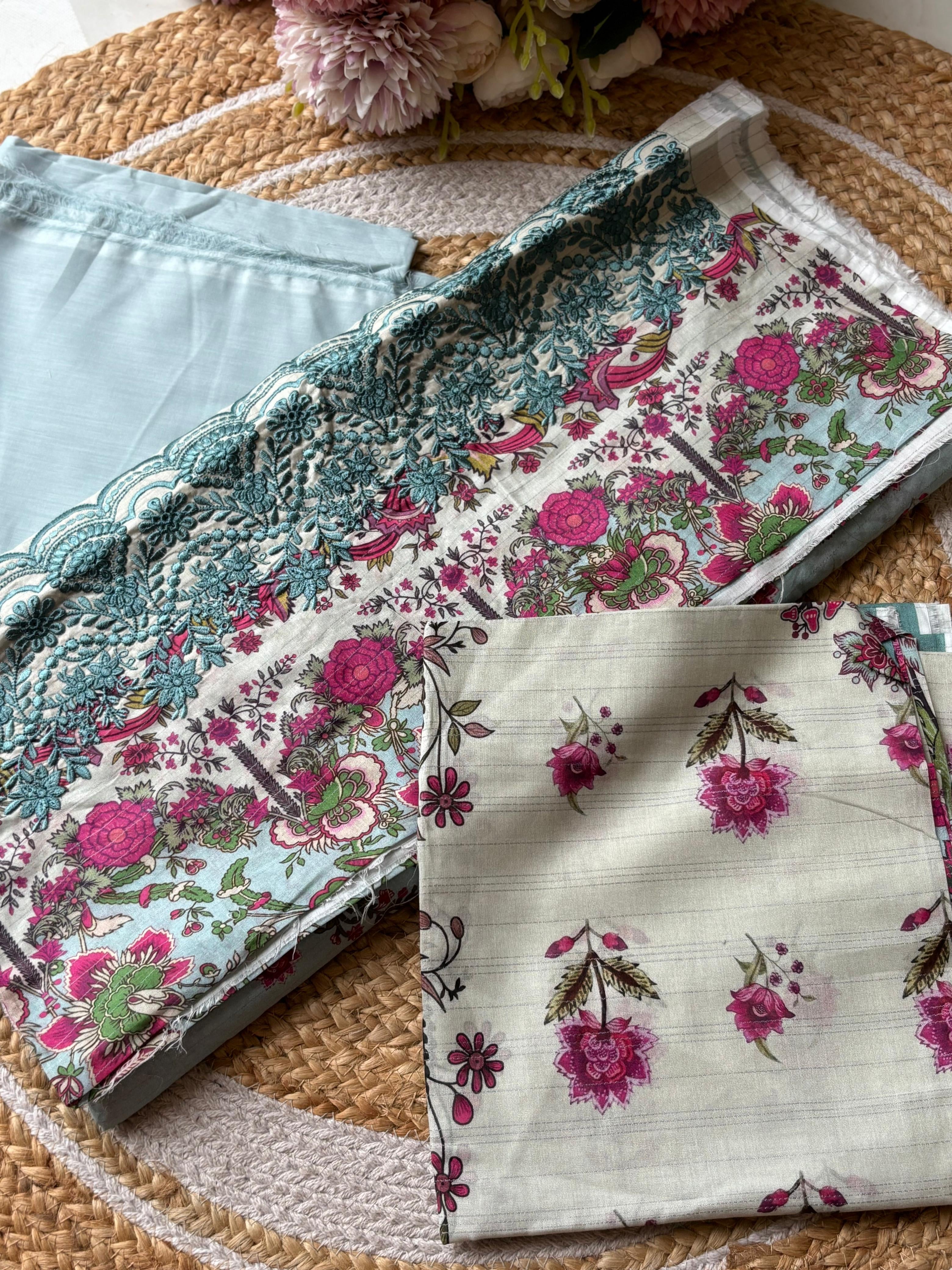Exquisite Khadi Fabric for a comfortable wear. Handwoven with love and care. Type: UnstitcheD Details Top Fabric: Digital Printed Cotton Satin | 3m Bottom Fabric: Dyed Cotton Satin | 2.5m Dupatta Fabric: Digital Printed Polyester Silk | 2.5m Material: Cotton Satin Add Ons: Embroidered Organza Front Hem and Sleeves Border |