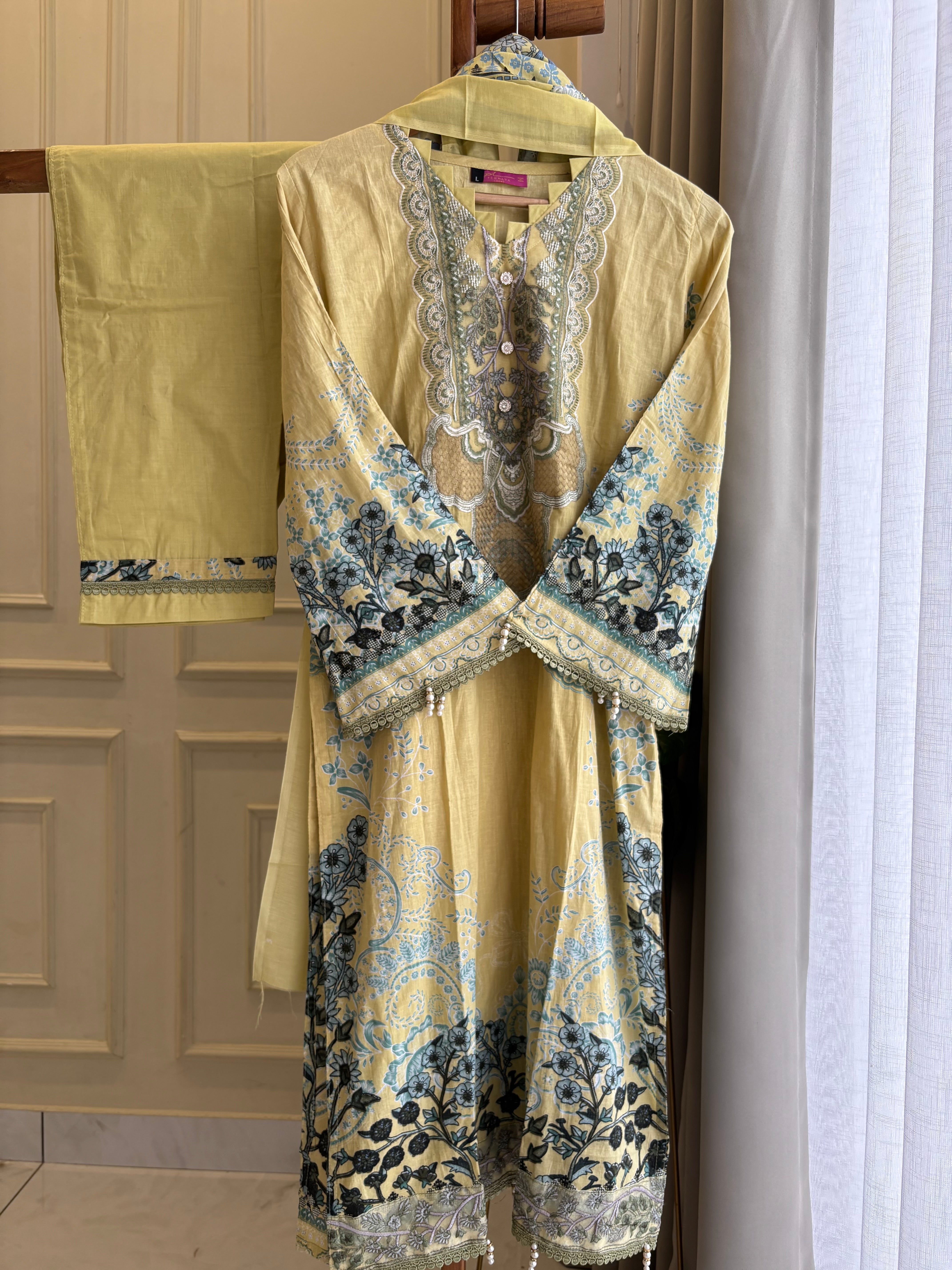 Type: Stitched/ ready  Top: Cotton embroidered  Bottom: Cotton  Dupatta: Floral Printed cotton dupatta Top Length: approximately 43-44  Sleeve Length: 20 Work: With elements like intricate lace, floral patterns, and embroidery. Fit: Casual wear Wash Care: Gentle wash Work: Embroidery and prints