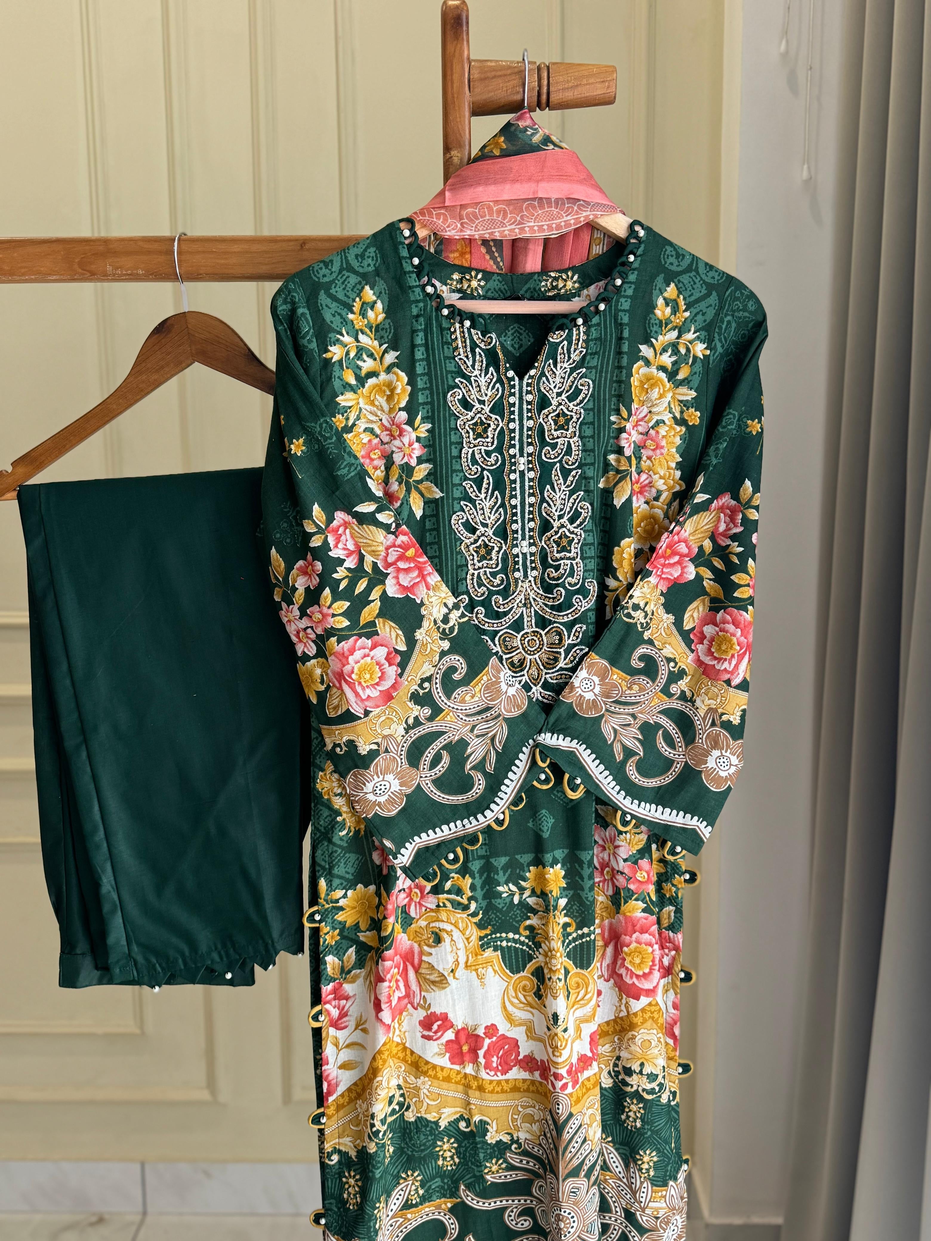 Type: Stitched Fabric: Cotton Bottom: Cotton  Dupatta: Chiffon Fit: Casual wear Wash Care: Gentle wash Work: Embroidery and prints