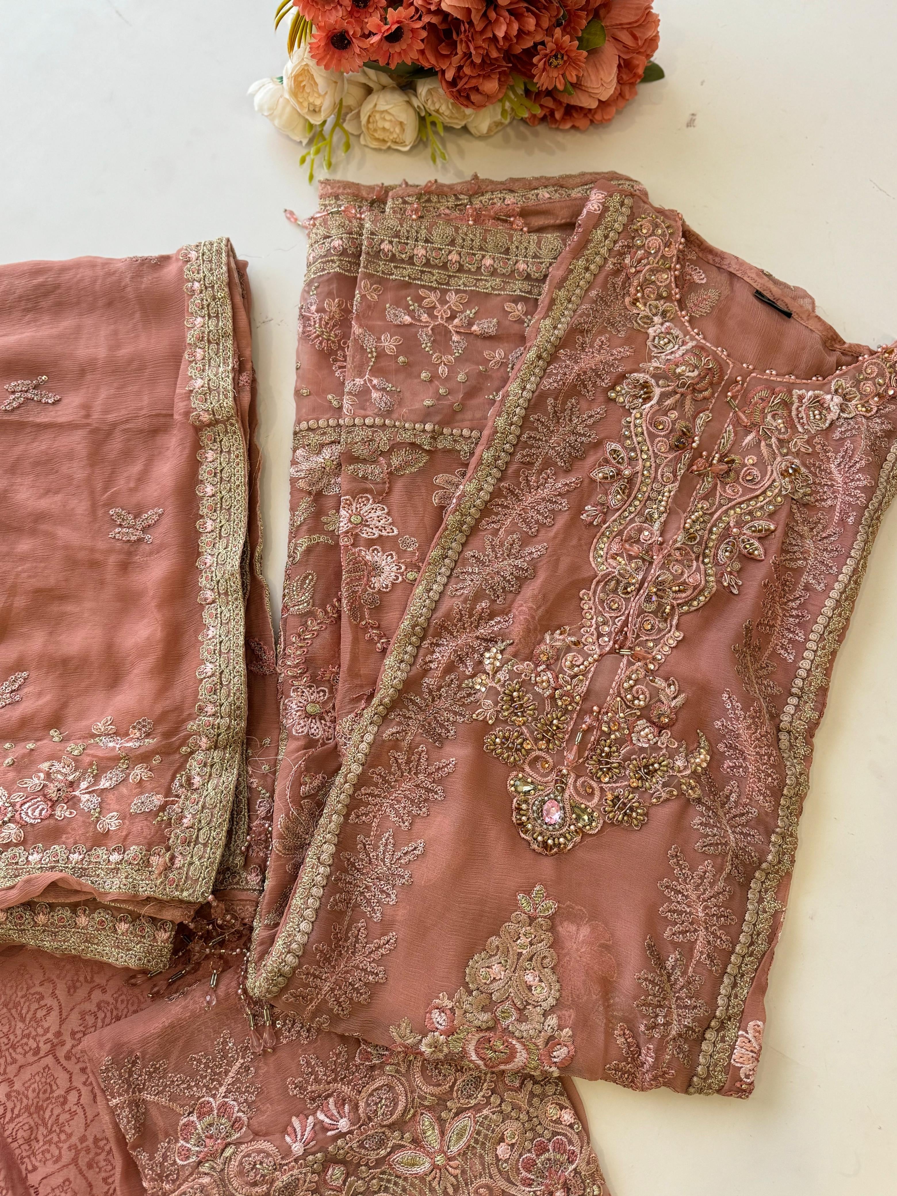 Enhance your wardrobe with a semi-stitched embroidered & hand embellished chiffon shirt,perfectly paired with an embroidered chiffon dupatta for a touch of elegance. Completethe look with dyed raw silk trouser, offering a blend of sophisticationand comfort for any occasion.
