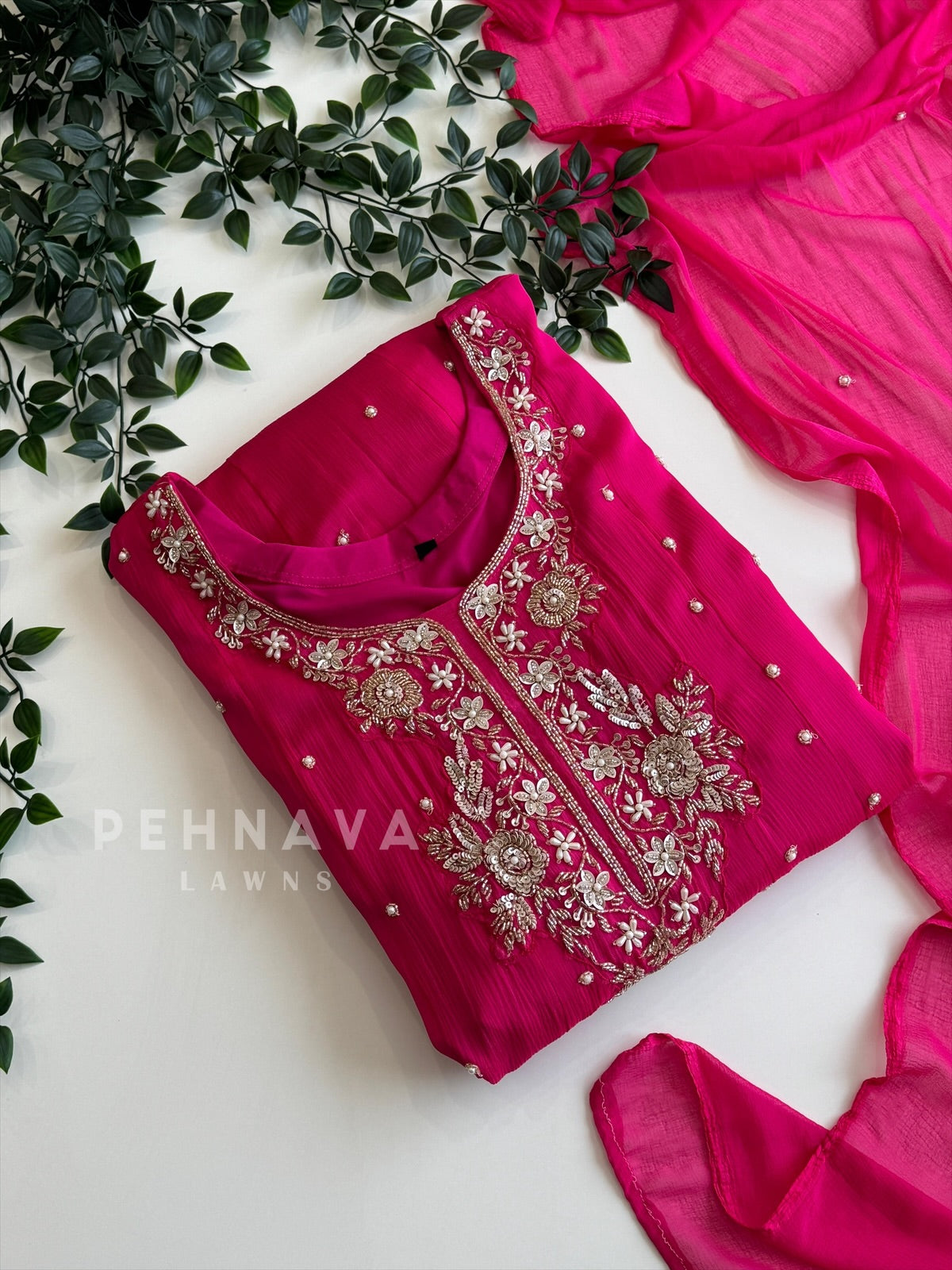 work:Bright pink kurta featuring intricate floral hand embroidery with bead detailing on the neckline and panels, paired with a soft chinnon bottom and a lightweight matching dupatta for an elegant festive look.