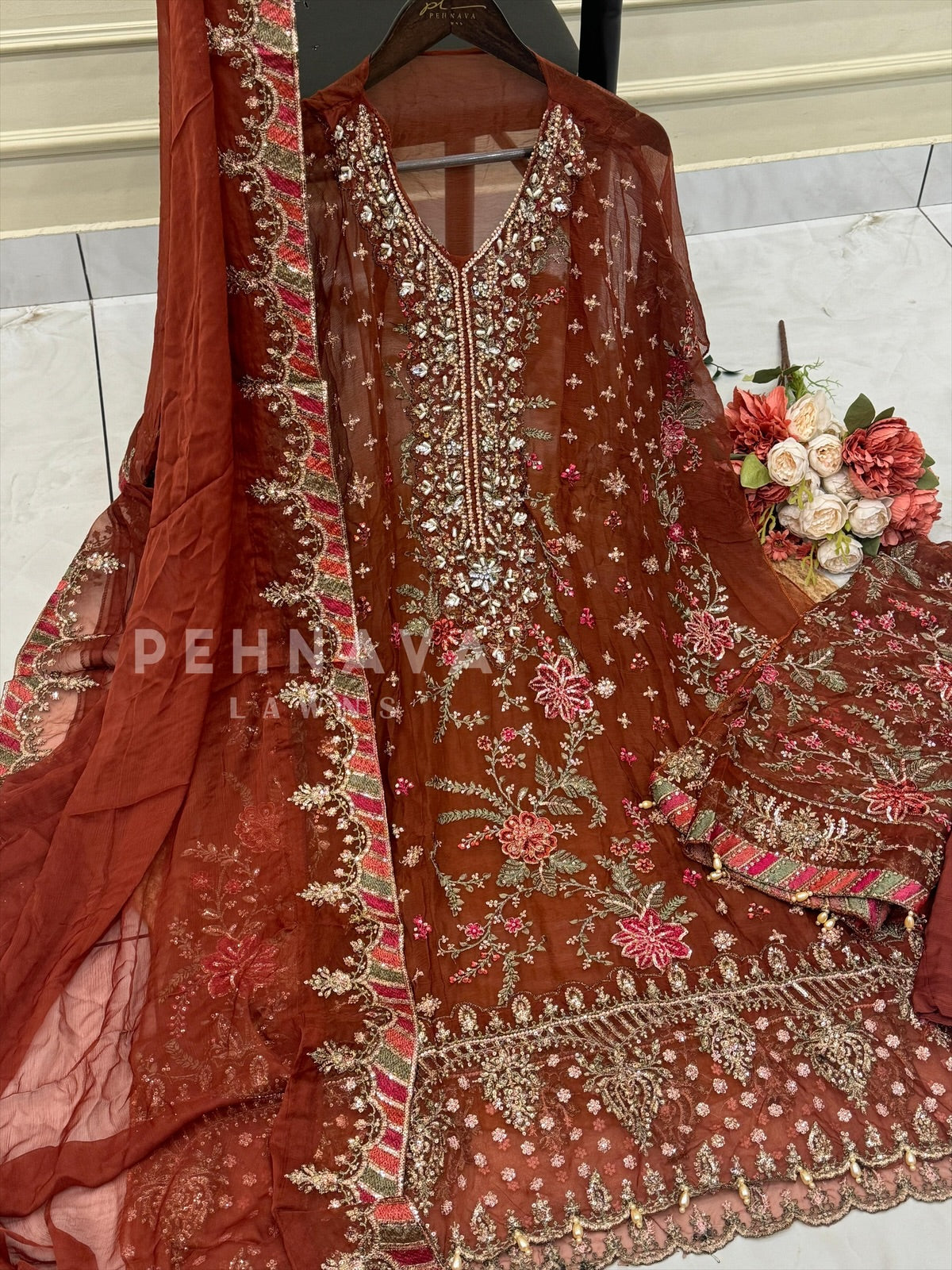 Description:Elegant suit set featuring intricate floral embroidery with rich zari, sequins, and beadwork highlighted across the neckline and body. Designed with detailed lace borders, fine thread motifs, and statement patterned panels for a refined finish. The dupatta is enhanced with ornate lace edging and delicate tassels, adding graceful movement and a luxurious touch.
