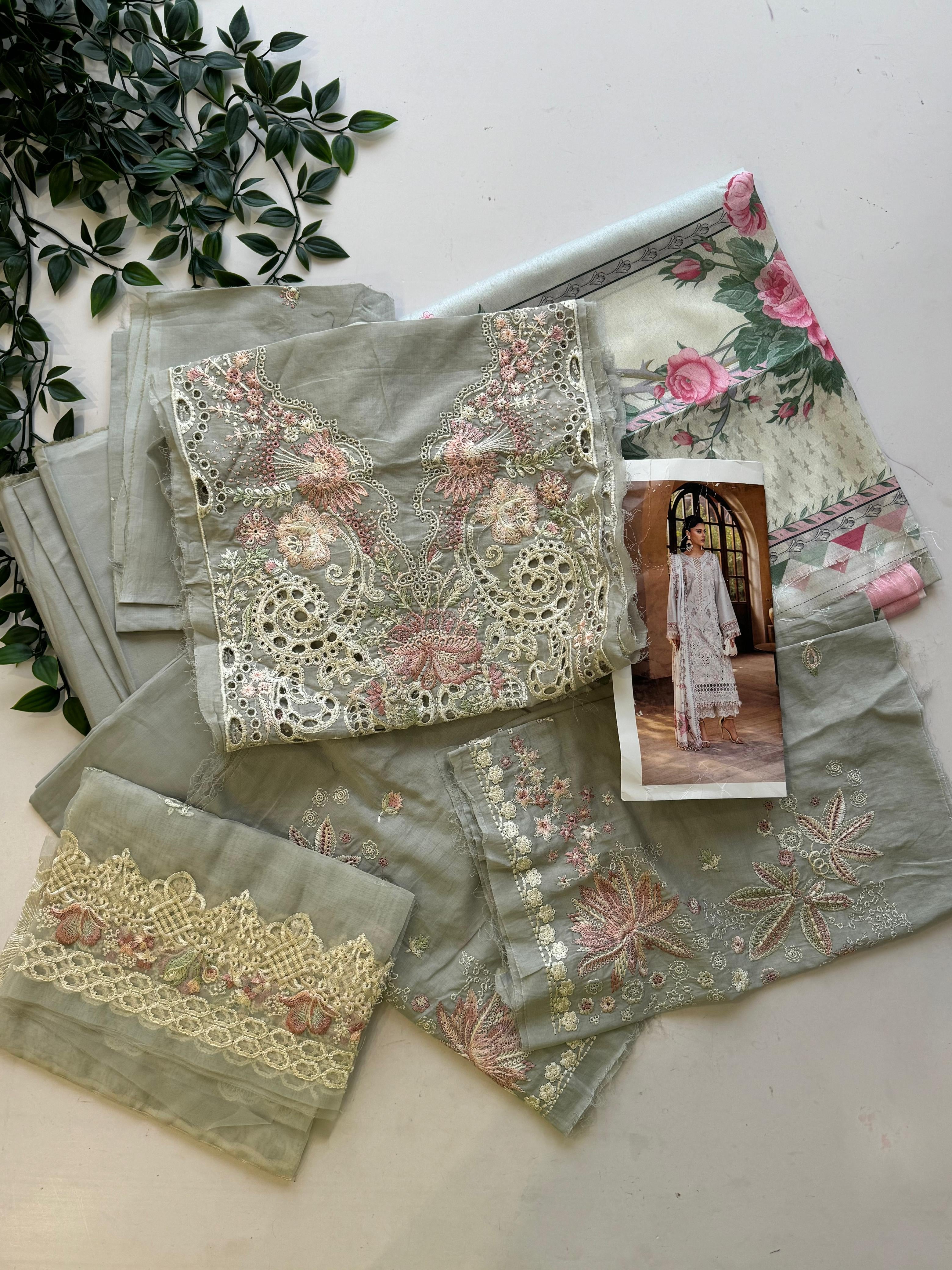 Shirt Dyed Lawn Embroidered Front Left & Right Penal 2 Piece Dyed Lawn Embroidered Sleeves 0.66 Meter Dyed Lawn Plain Back 1 Yard Dyed Lawn Embroidered Front Motif 1 Piece Embroidered Neck On Dyed Organza 1 Piece Embroidered Daman Motif On Dyed Organza 1 Piece Embroidered Left & Right Motifs On Dyed Organza 2 Pieces Dupatta Printed Silk Dupatta 2.50 Meter Trouser Dyed Cotton Trouser 2.50 Meter