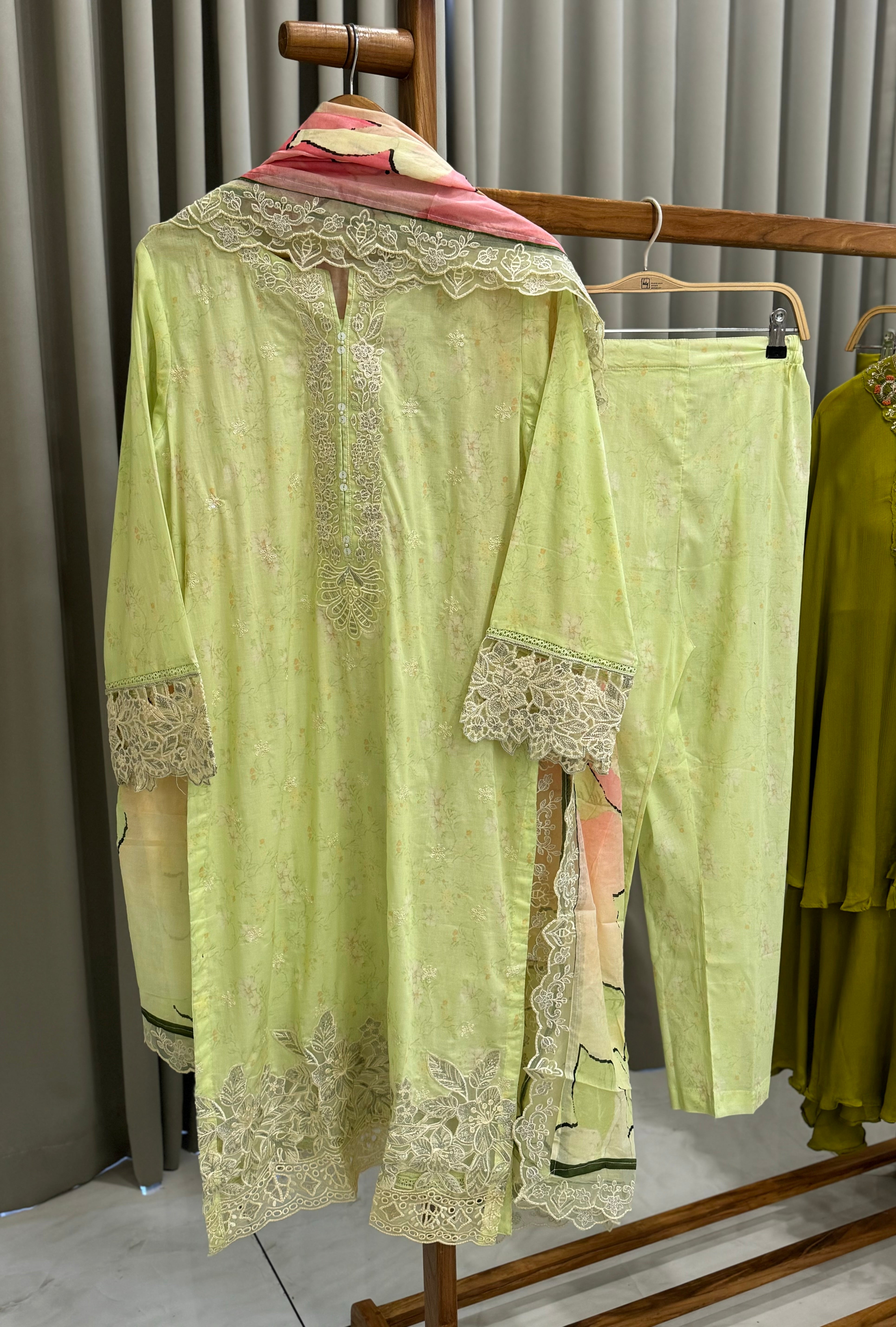Type: Stitched/ Ready Fabric: Pure Lawn Bottom: Lawn Material  Dupatta: Lawn Material  Work: Lace detailings Fit: Party wear/ Casual wear Wash Care: Dry Wash preferred  Size: Small, Medium, Large Length: 46 approx Sleeve Length: 23