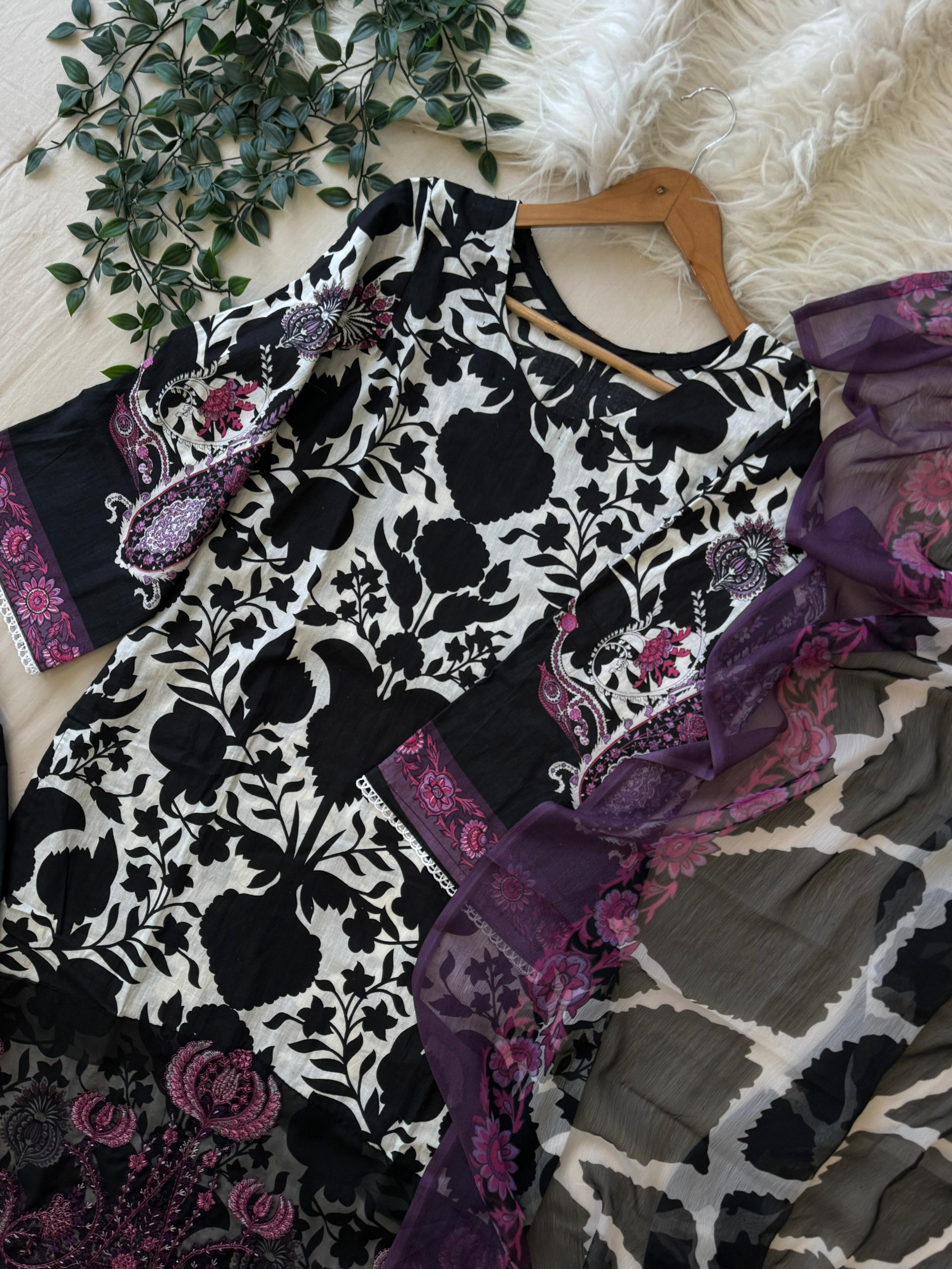 Type: Unstitched Fabric: Cotton Bottom: Cotton  Dupatta: Chiffon Fit: Casual wear/semi party wear Wash Care: Gentle wash Work: Embroidery and prints    This elegant outfit features a floral printed fabric with pastel shades. The ensemble includes a top adorned with intricate white lace embroidery and scalloped edges, complemented by a matching plane bottom.