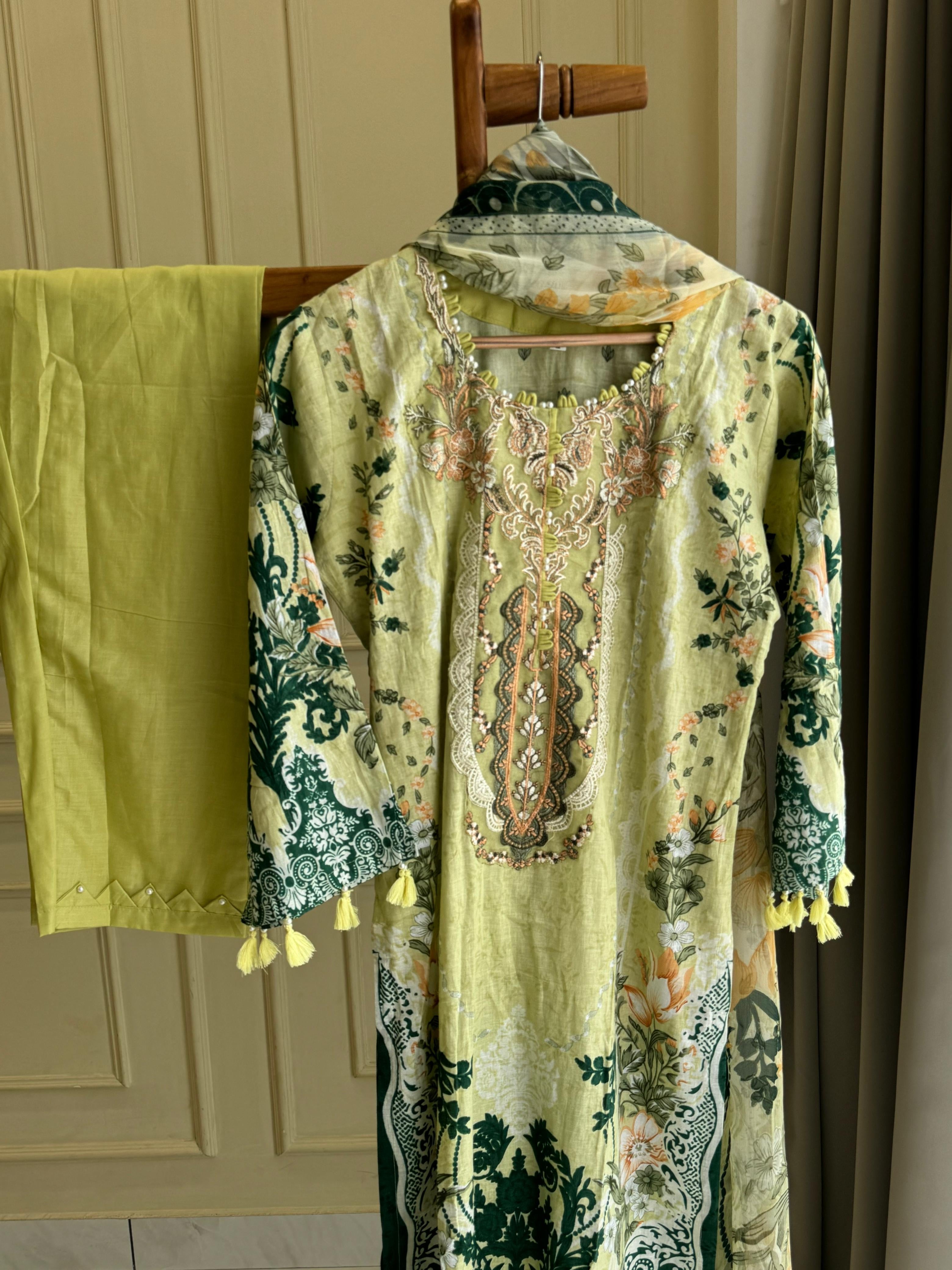 Type: Stitched/ ready  Top: Cotton embroidered  Bottom: Cotton  Dupatta: Floral Printed chiffon dupatta Fit: Casual wear Wash Care: Gentle wash Work: Embroidery and prints