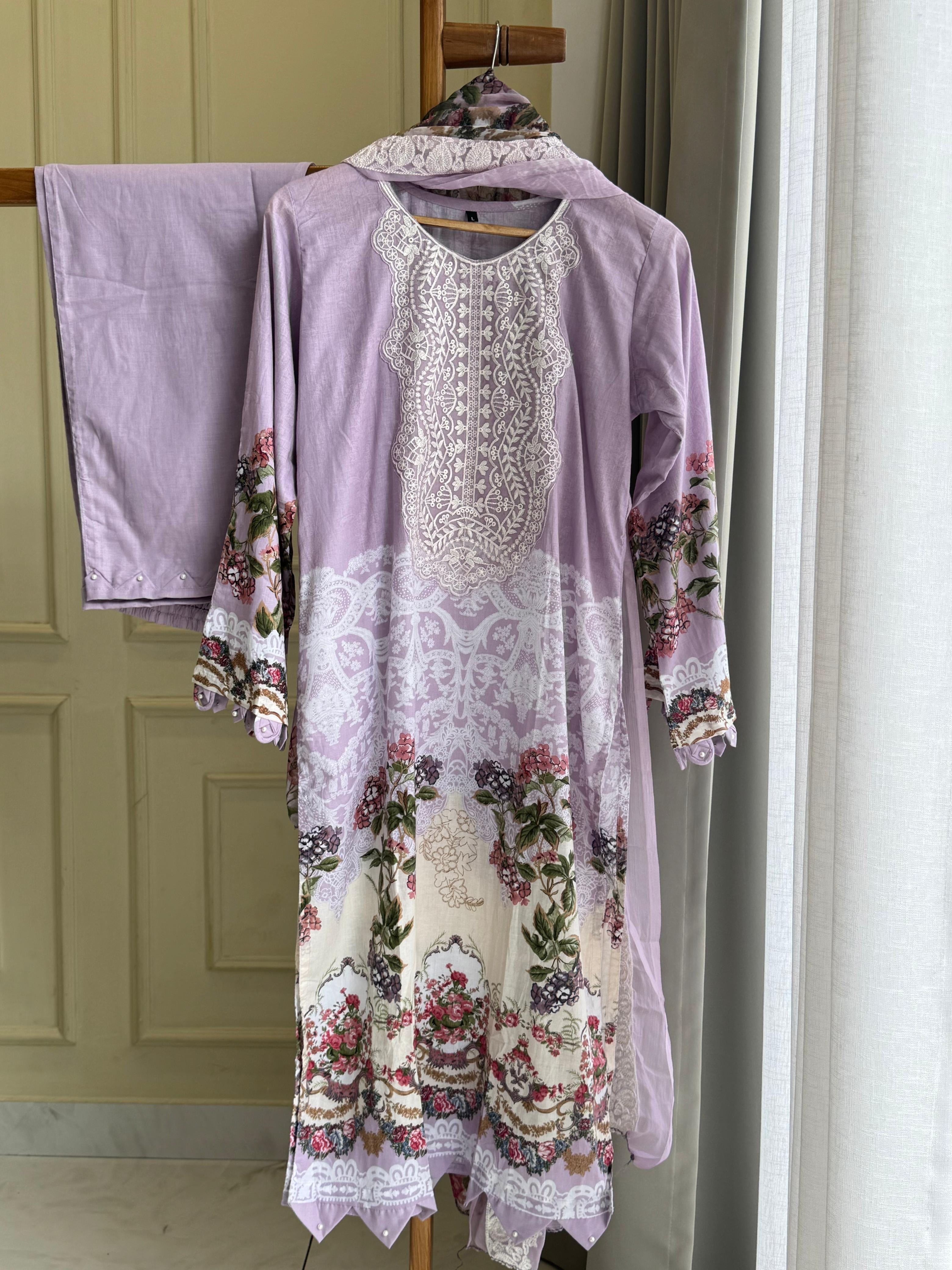 Type: Stitched/ ready  Top: Cotton embroidered  Bottom: Cotton with pockets and pearl detailings Dupatta: Floral Printed chiffon dupatta Fit: Casual wear Wash Care: Gentle wash Work: Embroidery and prints