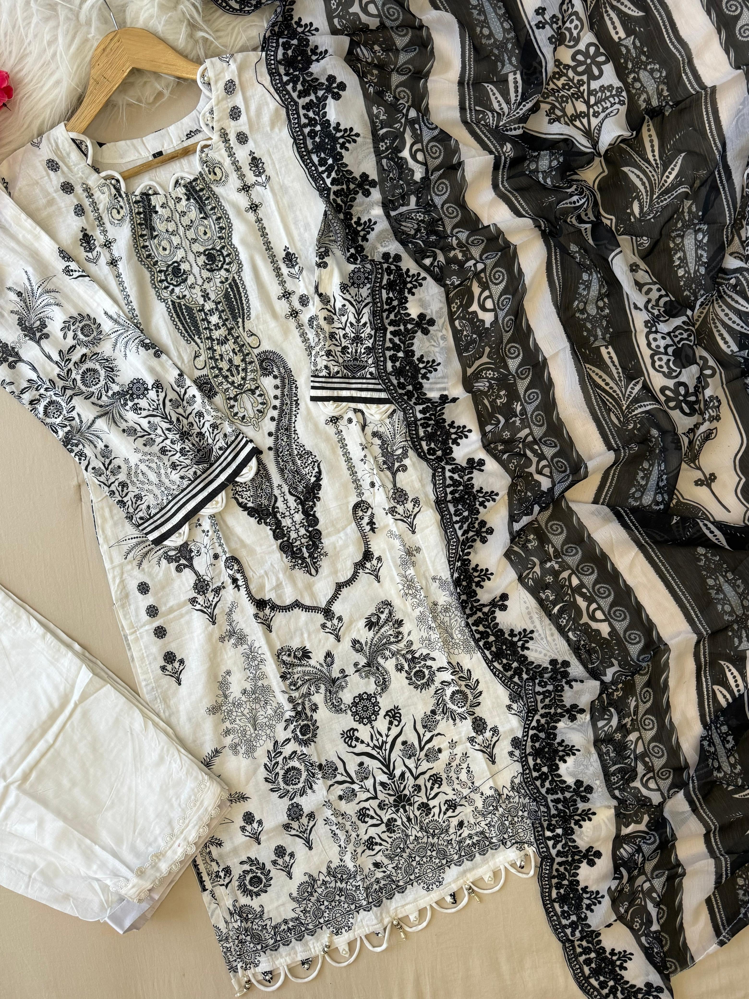 Type: Stitched(Lining included) Fabric: Cotton Bottom: Cotton  Dupatta: Chiffon/ Cotton Fit: Casual wear Wash Care: Gentle wash Work: Embroidery and prints  Here's a description for the outfit in the image for a website: "Elevate your ethnic look with this stunning  kurti set! 🌿✨ Featuring intricate block prints in black and gold accents, this outfit includes a beautifully crafted kurti with a matching dupatta. Perfect for casual outings or festive occasions, this outfit blends comfort and style effortlessly. Pair with statement jewellery for a chic look! 💃🏽